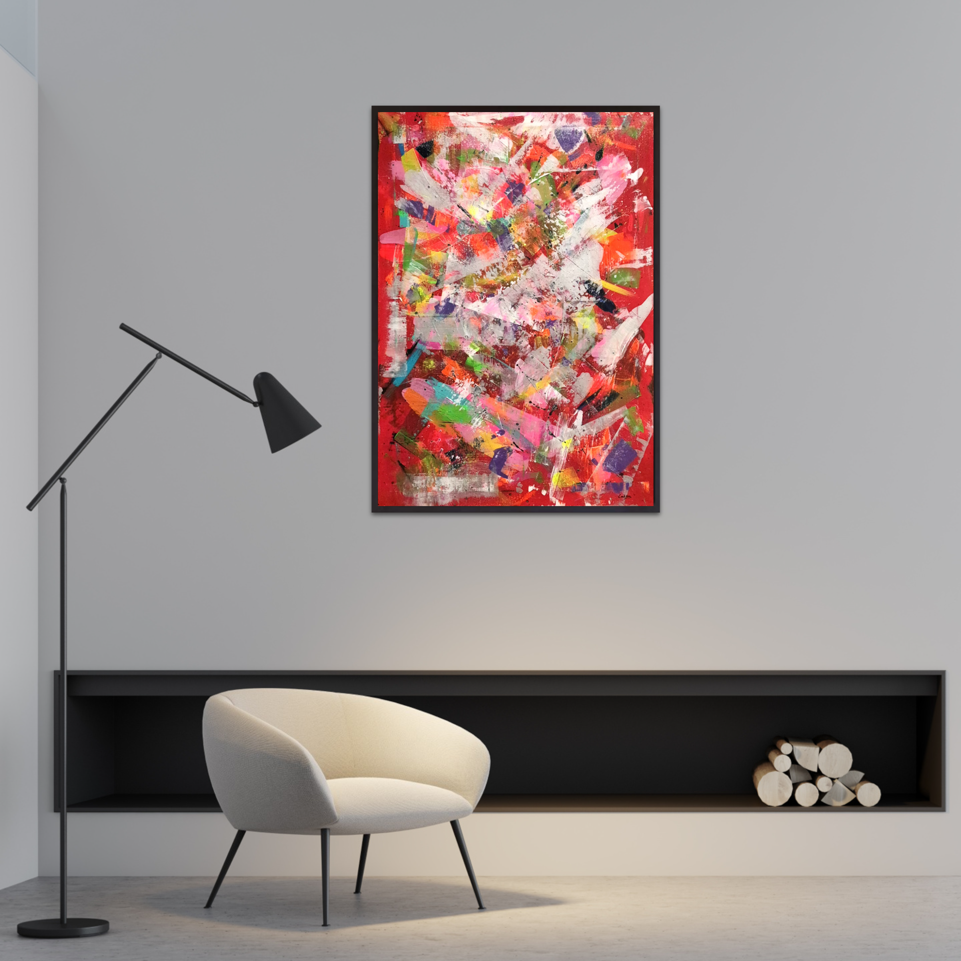 Dominated by red tones, the work embodies inner conflict, urgency and layered emotion.